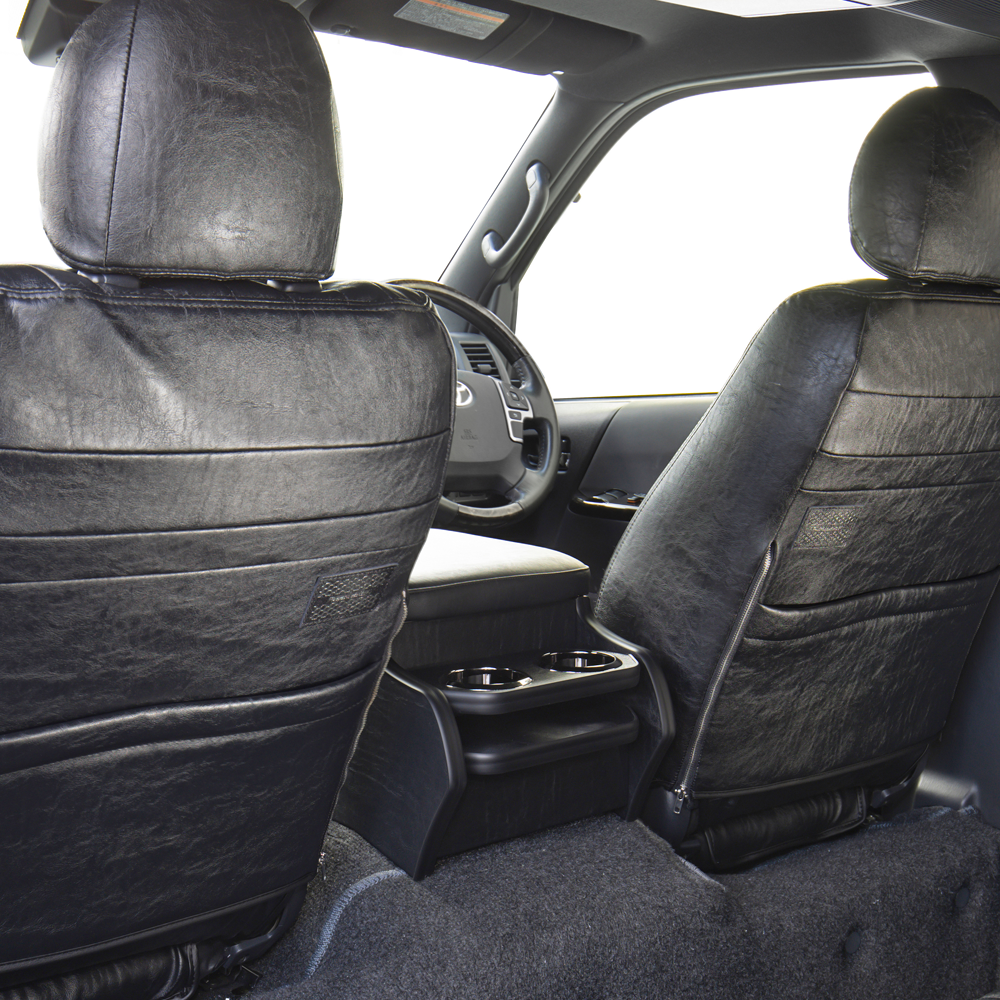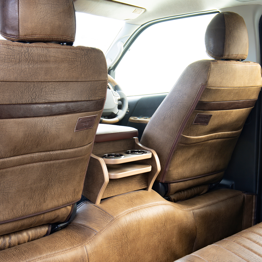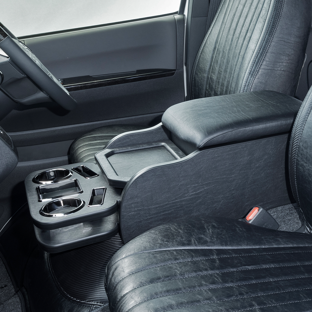 フロントにスマホホルダーを2つ設置しメッキリングで縁取り。色んなものが楽々収納できる実用性が魅力です。天板の程よい高さと表面の柔らかい肌触りが、長時間運転の肘掛として優しくサポートし、疲れを軽減してくれます。
